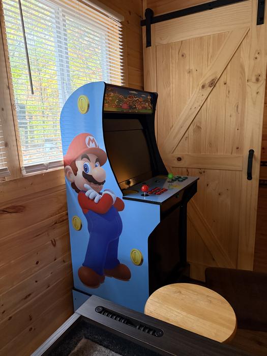 • Game room with 75″ TV, Mario arcade, shuffleboard, air hockey, Infinity game table